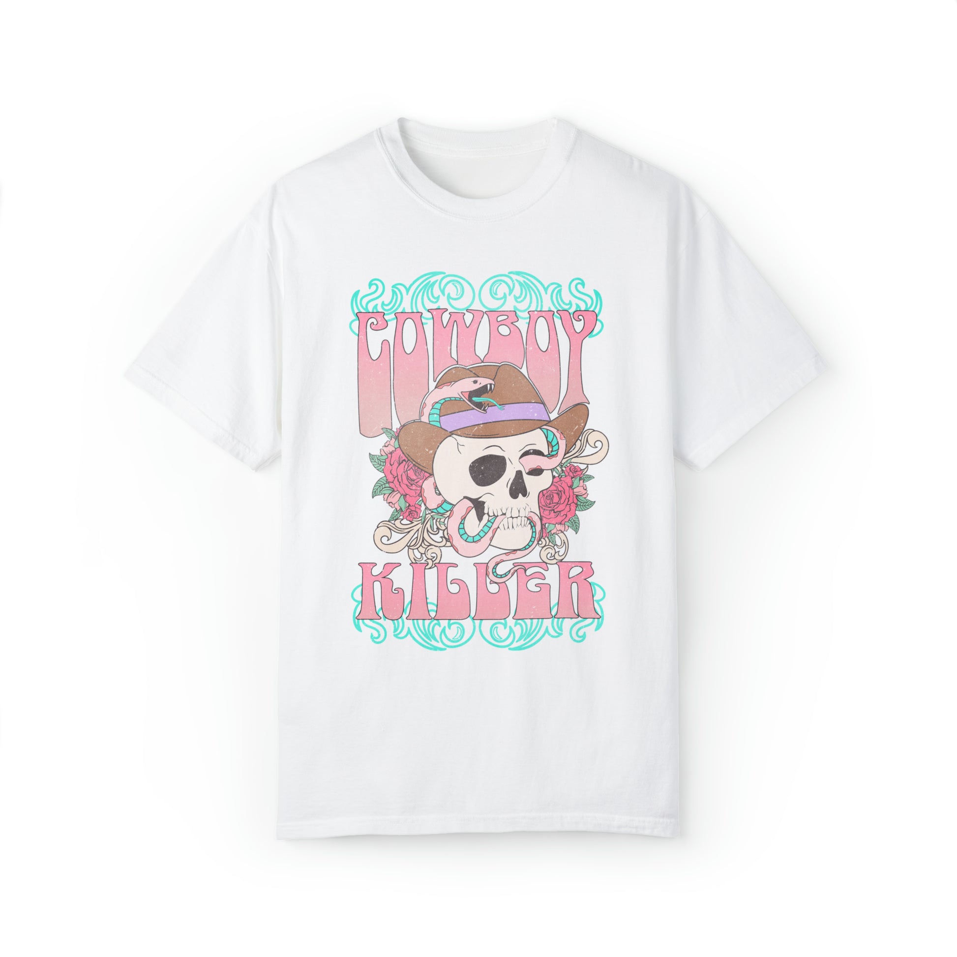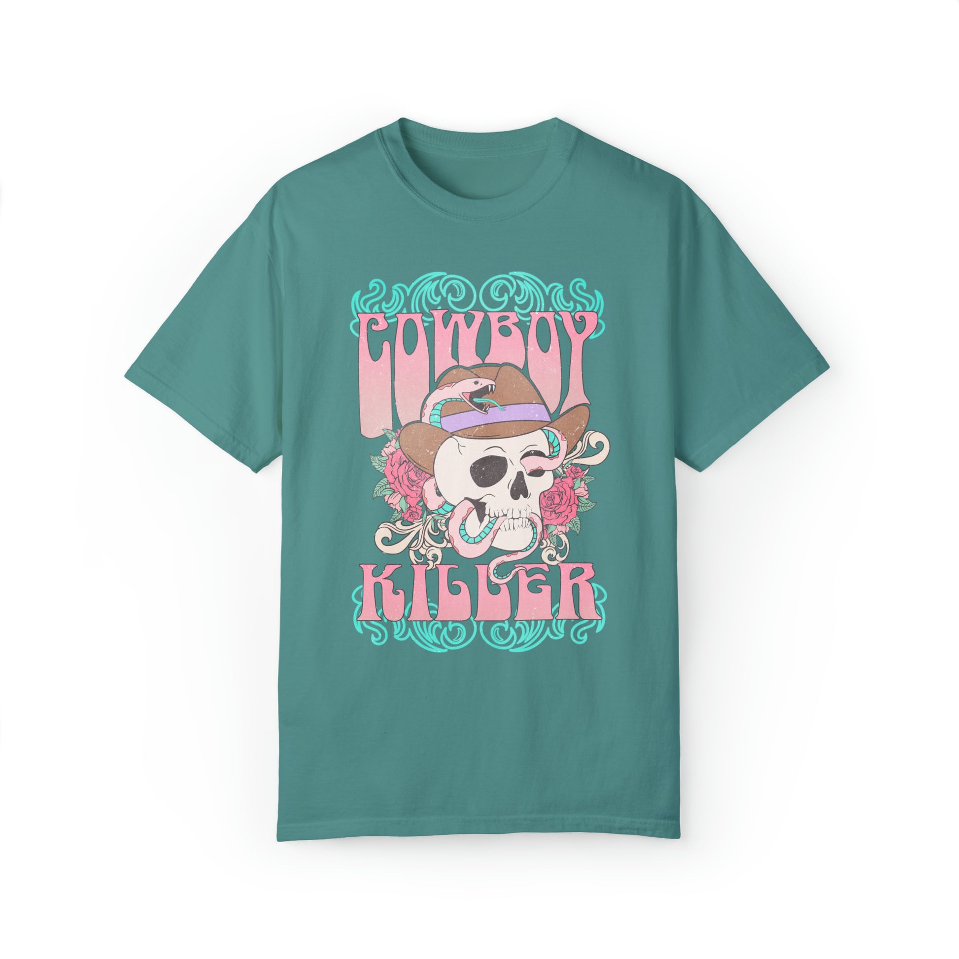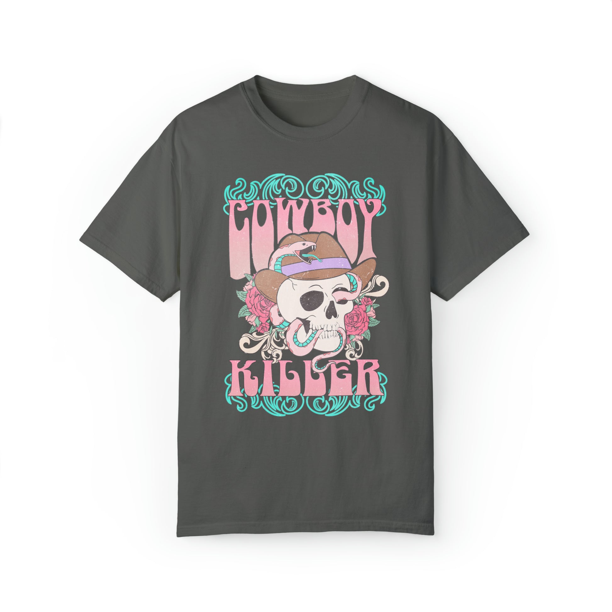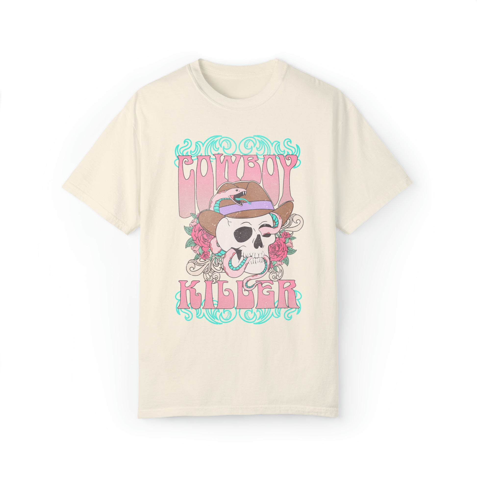 Ride on the edge of style with our Comfort Colors Western Graphic Tee, showcasing a trendy skull design that reads "Cowboy Killer." Embrace the fearless spirit of the frontier with this edgy and fashionable t-shirt. Crafted for both comfort and flair, this tee is a must-have for those seeking a unique Western statement. Shop now and make a bold impression with our Cowboy Killer Comfort Colors Graphic T-shirt.