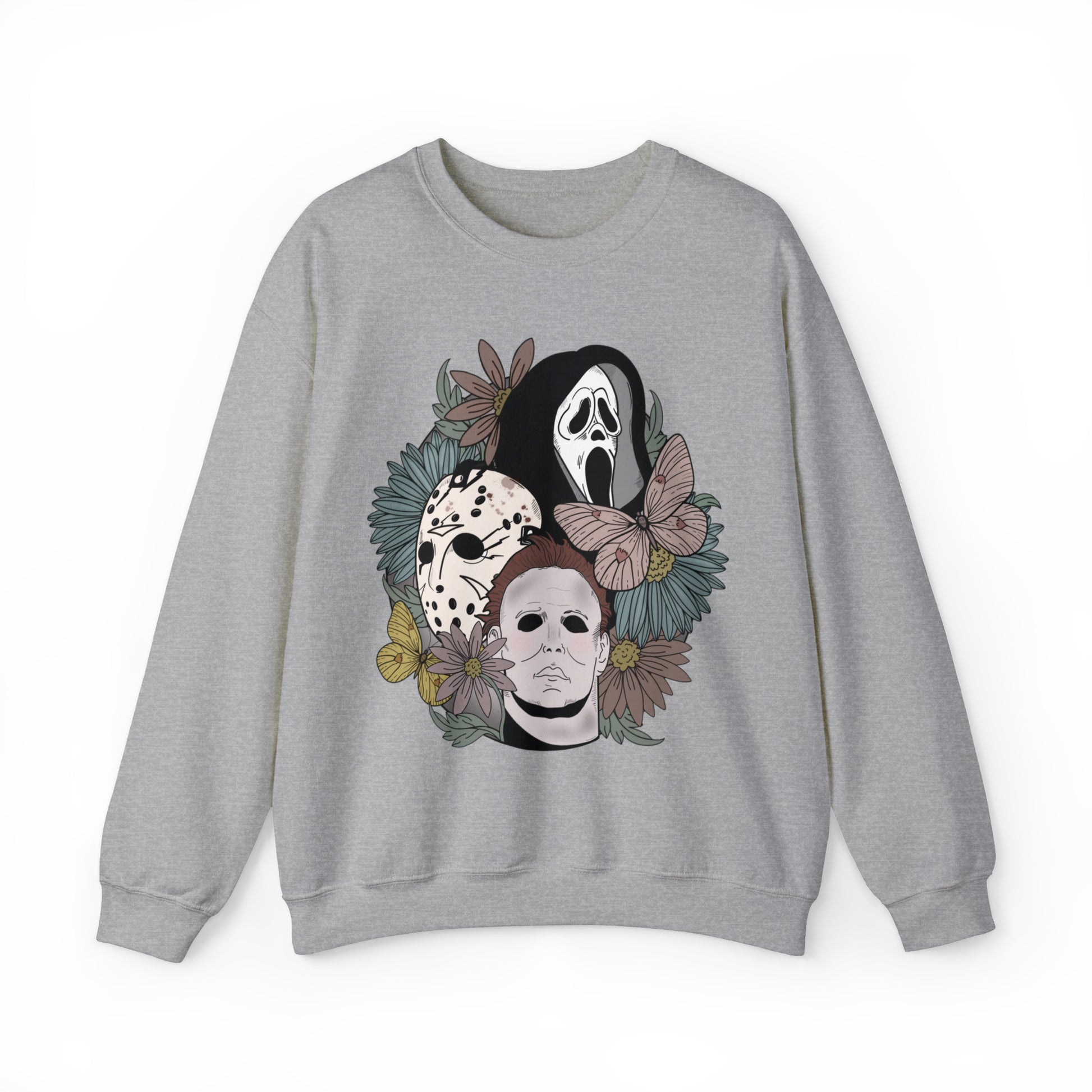 Frighten in style with this Floral Horror Movie Halloween Sweatshirt! Featuring iconic serial killers Michael Myers, Jason Voorhees and Ghostface, this comfy sweatshirt is perfect for celebrating the spooky season in eerie yet fashionable style.