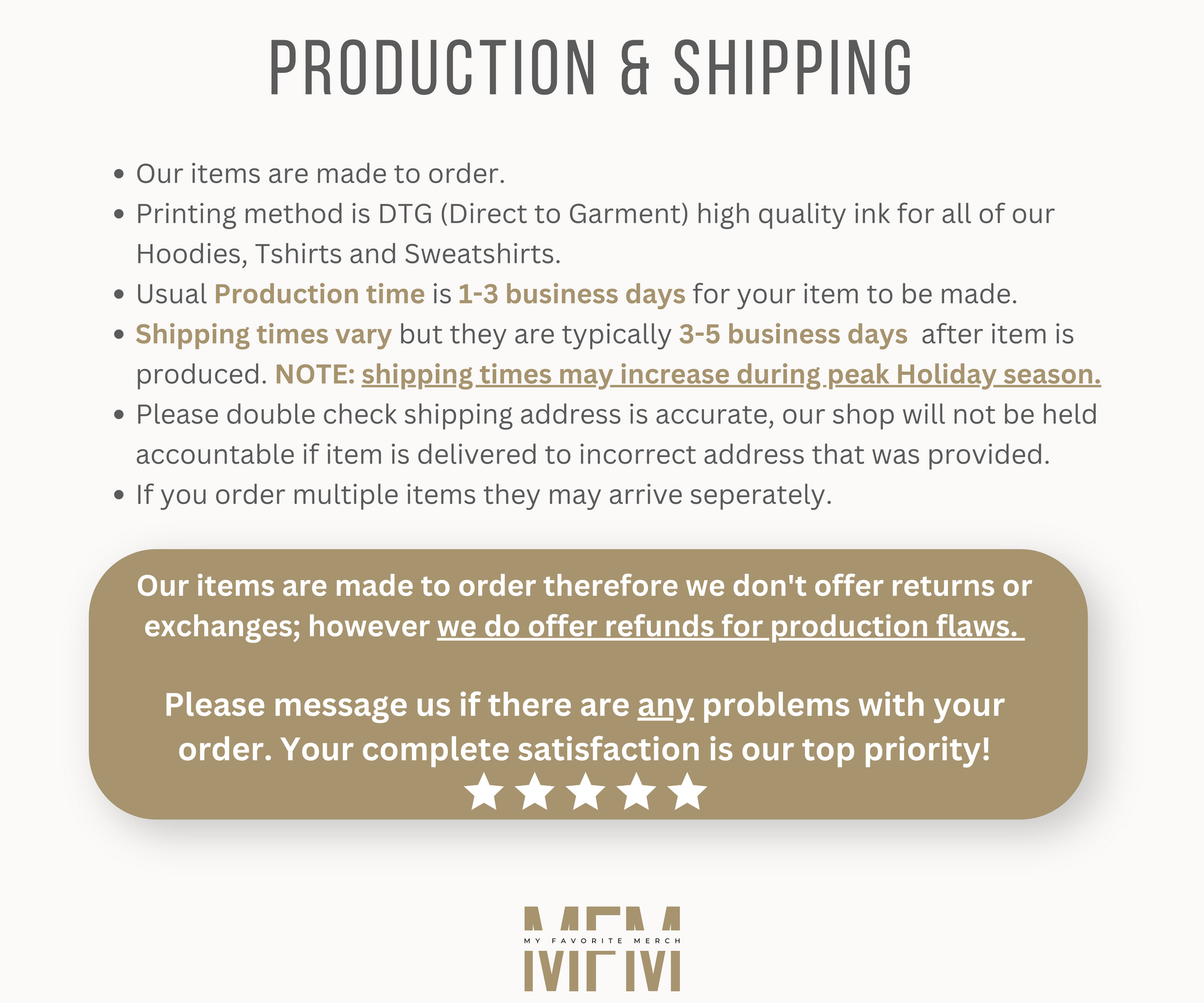 Production: Our items are made to order. No mass production here! Printing method is DTG (Direct to Garment) and utilizes a high-quality ink for all of our Hoodies, T-shirts and Sweatshirts and printed right here in the U.S.A.